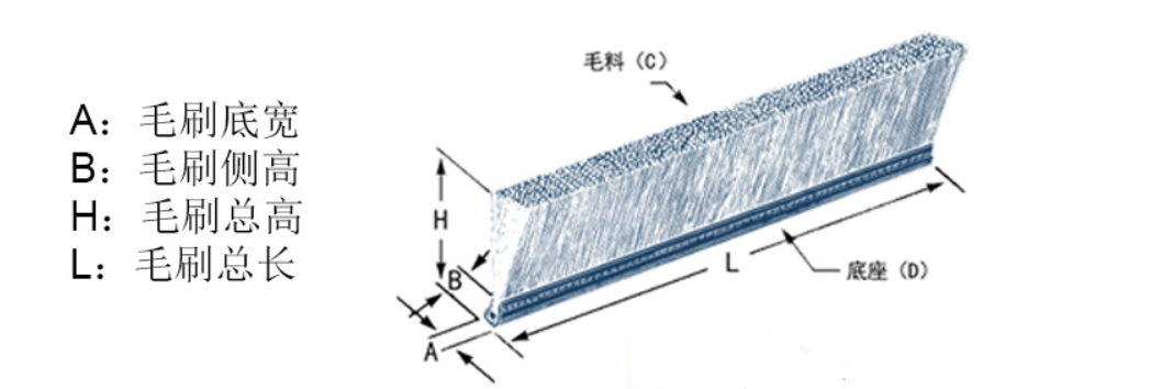 毛刷的參數有四部分組成,分別是底寬、側高、總高、總長(cháng)。底寬、側高常規為3-5mm,總高常規為20-80mm,我司底寬、側高可生產(chǎn)范圍為2.5-12mm,總高可生產(chǎn)范圍為8mm-150mm,如下圖所示: